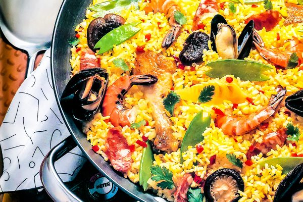 Paella, Spain's most famous dish is undoubtedly one of the world's great rice dishes. The first time I saw a traditional paella pan, I thought it was a particularly shallow flat-bottomed wok. That got me thinking about how a Chinese cook would prepare the same dish. The result is this East-West hybrid that works especially well in an electric wok.