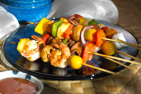 - Remove shrimp from marinade; reserve marinade. On each skewer, thread 1 shrimp, 1 pineapple chunk, 1 piece bell pepper, and 1 more shrimp.