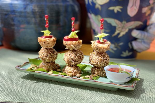 - In a food processor, process shrimp and seasoning ingredients until just finely chopped. Place in a bowl and add chopped pistachios. 用食物料理机将虾和调味料加工成细腻的虾蓉。把虾蓉放在一个碗中,加入开心果碎。