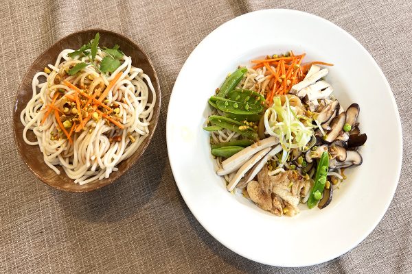 - Top noodles with bamboo piths, snow peas, carrot, green onions and preserved vegetables. Whisk dressing ingredients to recombine and pour over noodles and vegetables. Toss well.